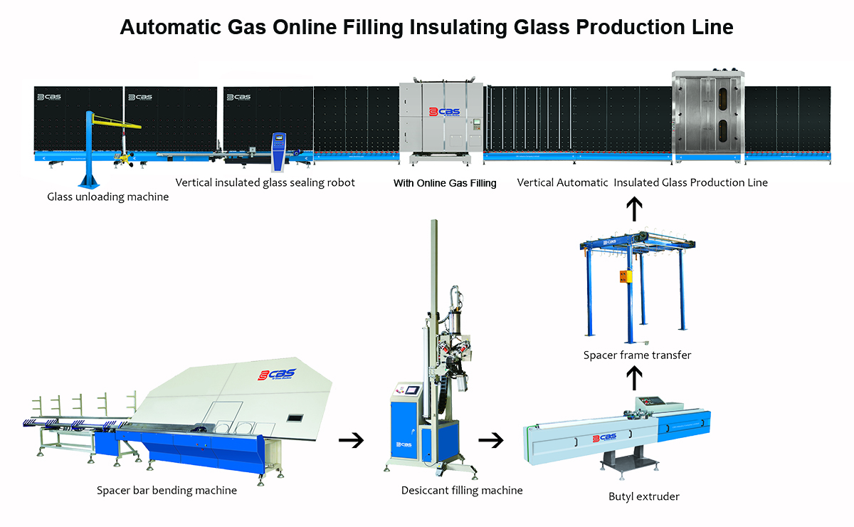 Automatic gas online filling Insulating glass production line, butyl coating machine, sealant coating machine, aluminum bending machine, desiccant filling machine, aluminum spacer framer transfer machine.